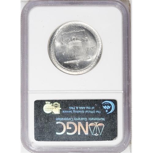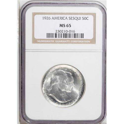 <B>1926<50C> Sesquicentennial MS65 NGC.</B></I> Well struck with exceedingly bright luster and untoned silver surfaces that seem to have been carefully preserved from harm. Some wispy chatter marks near the center of each side are minimally distracting. This commemorative issue portrays George Washington and Calvin Coolidge on its obverse design.