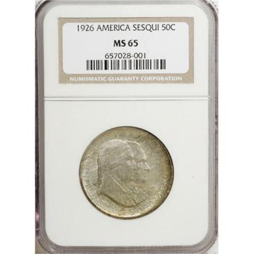 <B>1926 50C Sesquicentennial MS65 NGC.</B></I> All of the attributes of a high quality Sesquicentennial are present on this attractive, wholly original example. The strike is uncannily sharp and even the presence of multicolored toning streaks of moderate depth do not deter the coin's outstanding luster. A few pinpoint marks on the design elements are easily overlooked.<BR><BR><b>Shipping:</b> Coins & Currency (<a target="_blank" href="http://www.heritageauctions.com/common/shipping.php">view shipping information</a>)