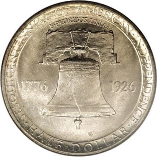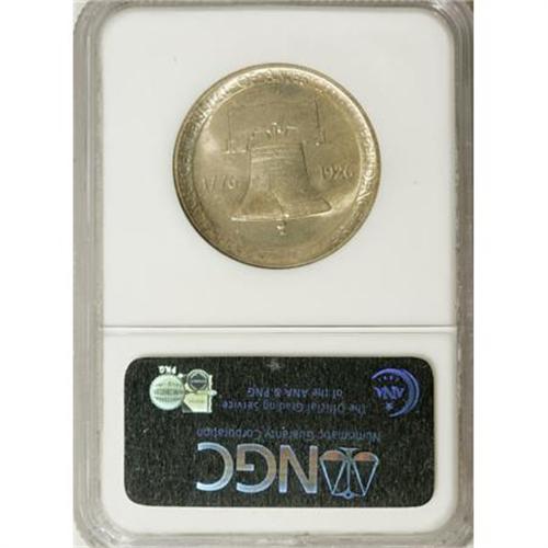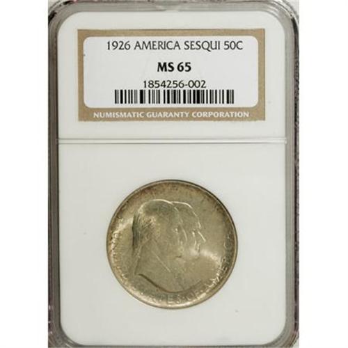 <B>1926 50C Sesquicentennial MS65 NGC.</B></I> Firmly struck with traces of light toning and intense satiny luster. Some wispy chatter marks on Washington's cheek may have prevented an even loftier grade assessment. Included with the lot are five different 1926 Sesqui postcards,<BR>one of them postmarked Aug. 25 1926; four tickets to the 1926 Philadelphia Exposition, dated Nov. 28 and Nov. 30; two unused Christmas cards; and an envelope printed with the logotype for the 1926 Sesqui-Centennial exposition.<BR><I>From The Frank DuVall Collection of U.S. Commemoratives.</B></I><BR><BR><b>Shipping:</b> Coins & Currency (<a target="_blank" href="http://www.heritageauctions.com/common/shipping.php">view shipping information</a>)