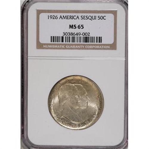 <B>1926 50C Sesquicentennial MS65 NGC.</B></I> Although it is one of the more common issues of the classic commemorative series in circulated and lower Mint State grades, the Sesqui. half becomes elusive in grades of Gem and rare any finer. Part of this is due to the shallow relief which creates a subtle and nuanced design that lends itself to weakness and abrasions. Light Champagne toning is seen, accented with russet shades. The luster is well above average as is the overall eye appeal. Census: 241 in 65, 15 finer (12/07). <BR><BR><b>Shipping:</b> Coins & Currency (<a target="_blank" href="http://www.heritageauctions.com/common/shipping.php">view shipping information</a>)