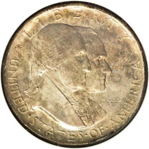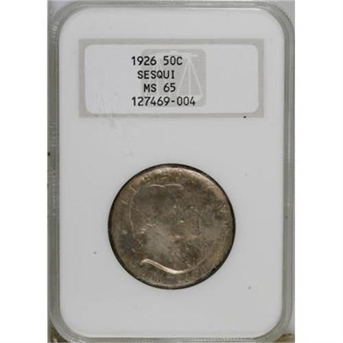 <B>1926 50C Sesquicentennial MS65 NGC.</B></I> Fully toned in iridescent honey-gold, powder-blue, rose-red, and apricot. This satiny Gem exhibits minimal contact, and is boldly struck except for the unavoidable slight softness on Washington's cheekbone and eyebrow. Housed in an early pre-hologram NGC holder. A conditionally rare type.<BR><BR><b>Shipping:</b> Coins & Currency (<a target="_blank" href="http://www.heritageauctions.com/common/shipping.php">view shipping information</a>)