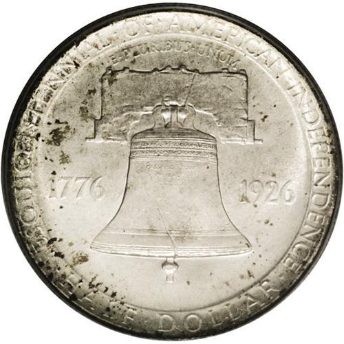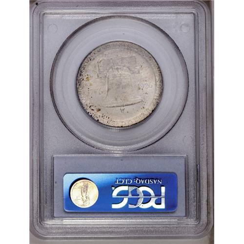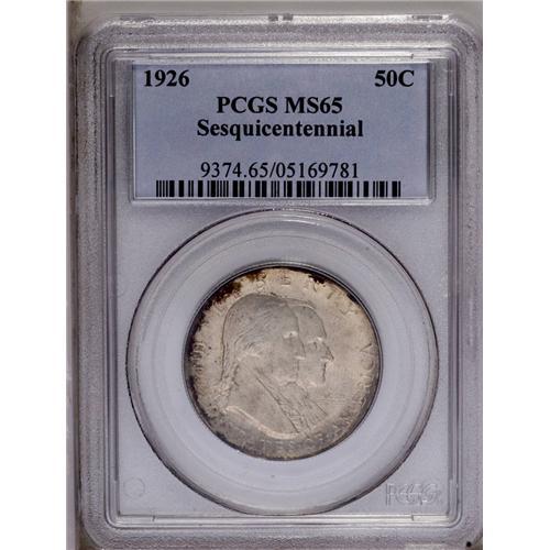 <B>1926<50C> Sesquicentennial MS65 PCGS.</B></I> A beautifully preserved example that boasts uncommon sharpness for this conditionally rare issue, and is toned in the centers in original shades of pale yellow-gold and light-gray. Specks of russet and dark-green are noticed about the borders on both sides, as well as in the reverse fields. The underlying surfaces are highly lustrous. Gem Sesquicentennial half dollars are among the most difficult issues in the entire silver commemorative series.