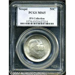 <B>1926<50C> Sesquicentennial MS65 PCGS.</B></I> Booming cartwheel luster shimmers across this exquisitely preserved Gem. Hints of honey-gold color are the strongest below the conjoined busts, although the piece is otherwise lightly toned. Well struck for the low relief type with the exception of George Washington's cheek, which has stria from the planchet prior to the strike as do all Sesquicentennial Halves. "Silent Cal" Coolidge was the current President at the time of the Sesquicentennial, and thus became one of the first living individuals to appear on a U.S. coin.<BR><I>From the JFS Collection, the #1 All-Time PCGS Registry Set.</B></I> <BR><BR><B>Important notice:</B> Heritage usually auctions material at the rate of 200-250 lots per hour. On some occasions eBay Live bid software or the Internet may not be able to keep up with the pace of the auction. We recommend placing a realistic absentee bid now as insurance to avoid disappointment. Occasionally the auctioneer may eliminate or reject an eBay Live bid, and the auctioneer may also reopen a lot after the close of the eBay live bidding (usually because we missed an audience bid), and may reject your bid even if it shows you as the winning bidder. By bidding via eBay Live, you agree that Heritage may award the lot to another bidder at its sole discretion under the circumstances described above or any other reasonable circumstances. Since eBay bids are not shown to us until we open the lot on the floor, we treat those bids just like floor bids. In most cases the floor responds before the eBay bid is presented to us, due to Internet lag time, so for consistency we have made it a policy that floor bids are always considered first over tie eBay live bids. Also please note that all Heritage lots purchased through eBay Live carry a 20% Buyer's Premium. Please make sure you read the Terms and Conditions before you bid. </span></font></tr></table></td></tr></table>