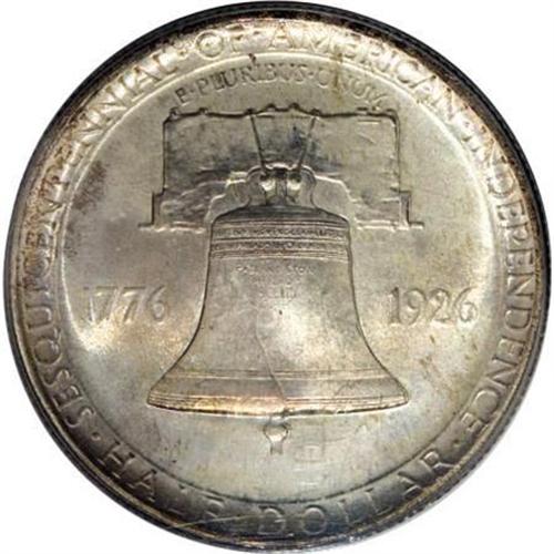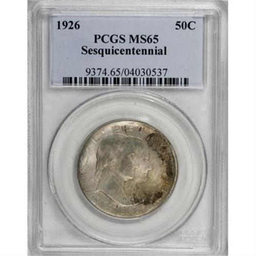 <B>1926 50C Sesquicentennial MS65 PCGS.</B></I> The mint occasionally overestimates how popular certain coins will be with the public. That happened to proofs from 1859-1860, modern mint products, and it certainly happened with the Sesquicentennial half dollar. Just over a million pieces were struck in anticipation of brisk sales at $1 per coin, but 859,408 pieces were returned to the mint to be melted. Of those 140,592 pieces sold, few were set aside in pristine condition. This is a lovely example that show excellent mint luster with an irregular overlay of golden-brown and russet toning on the obverse, and golden-lilac color on the reverse.<BR><BR><b>Shipping:</b> Coins & Currency (<a target="_blank" href="http://www.heritageauctions.com/common/shipping.php">view shipping information</a>)