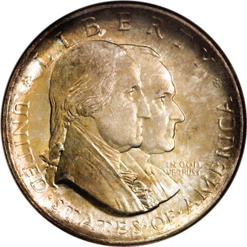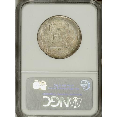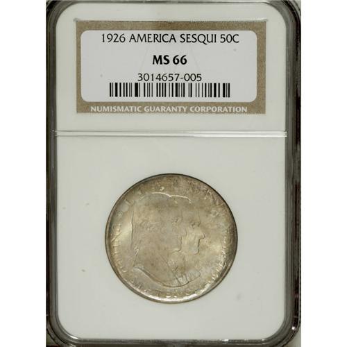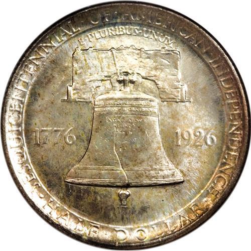 <B>1926 50C Sesquicentennial MS66 NGC.</B></I> This is far and away the nicest Sesquicentennial half dollar that the present cataloger has ever seen. Because of its initial low-relief design and the subsequent surface insults that plague so many coins of this issue, seldom are coins encountered in MS64 or finer grades. The present piece is a memorable exception, however, as the focal points--the accolated busts of Calvin Coolidge and George Washington on the obverse, and the highpoints of the Liberty Bell on the reverse--show only the slightest abrasions that are undistracting. But this coin's strong suit is its brilliant luster, which breaks forth unimpeded from beneath the light, lovely toning in shades of amber-gold, ice-blue, and yellow. It is seldom that a silver coin with so much lovely toning manages to also show strong cartwheel luster, but when one encounters such a rare combination, the results are extraordinary, as here. This coin is one of seven Premium Gems so graded at PCGS, with none finer (3/07). A not-too-lengthy perusal of the PCGS online <I>Population Report</B></I> will quickly confirm that this is by far the rarest classic silver commemorative coin in MS66 grade. While most silver commemoratives show PCGS-certified populations in the dozens to several hundreds, only the 1922 Grant with Star and the Missouri issues show comparably rare populations--and even they show populations in the range of two to three dozen coins each in MS66. A remarkable opportunity for commemorative specialists.<BR><BR><b>Shipping:</b> Coins & Currency (<a target="_blank" href="http://www.heritageauctions.com/common/shipping.php">view shipping information</a>)