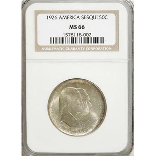 <B>1926 50C Sesquicentennial MS66 NGC.</B></I> The shallow relief of the Sesquicentennial half led to unsatisfactory striking and thus to the issue's reputation as one of the least aesthetically pleasing silver commemoratives. Q. David Bowers (1991) offered the following candid advice: "This low-relief coin ... is best forgotten if you are a connoisseur; but, as you need one for your set, your best bet is to wince and settle for an average coin ... "<BR> One hardly has to settle, however, as the Premium Gem offered here is anything but average. Rich golden-toning covers most of each side, while elements of brilliance visit the margins. The devices are better-defined than usual, and while a touch of granularity is noted on Washington's cheek (as always), the surfaces are practically devoid of post-striking flaws. A piece in MS66 is the best quality one can hope to acquire, as neither NGC nor PCGS has certified a Superb Gem example (10/07).<BR><BR><b>Shipping:</b> Coins & Currency (<a target="_blank" href="http://www.heritageauctions.com/common/shipping.php">view shipping information</a>)