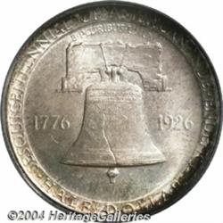<B>1926<50C> Sesquicentennial MS66 PCGS.</B></I> With surfaces that are free of all but a few inconsequential distractions, this premium quality Gem qualifies for Condition Census standing. The luster is exceptionally vibrant for the type, being frosty with swirling cartwheel effects. Moderate rose-gray patina is accented with crimson and emerald tones at selected border areas, and fully overlays the essentially pristine surfaces. The 1926 Sesquicentennial Half is one of the premier condition rarities in the U.S. Commemorative series, and Gems of even marginal quality must be considered rare. A high end example, of course, is the province of advanced specialists. Both major grading services report a total of only 14 coins in MS66, and none have been certified finer (6/04).<BR><I>Ex: New York Signature Sale (Heritage, 7/02), lot 5103, which realized $18,400.</B></I><BR><I>From the JFS Collection, the #1 All-Time PCGS Registry Set.</B></I> <BR><BR><B>Important notice:</B> Heritage usually auctions material at the rate of 200-250 lots per hour. On some occasions eBay Live bid software or the Internet may not be able to keep up with the pace of the auction. We recommend placing a realistic absentee bid now as insurance to avoid disappointment. Occasionally the auctioneer may eliminate or reject an eBay Live bid, and the auctioneer may also reopen a lot after the close of the eBay live bidding (usually because we missed an audience bid), and may reject your bid even if it shows you as the winning bidder. By bidding via eBay Live, you agree that Heritage may award the lot to another bidder at its sole discretion under the circumstances described above or any other reasonable circumstances. Since eBay bids are not shown to us until we open the lot on the floor, we treat those bids just like floor bids. In most cases the floor responds before the eBay bid is presented to us, due to Internet lag time, so for consistency we have made it a policy that floor bids are always considered first over tie eBay live bids. Also please note that all Heritage lots purchased through eBay Live carry a 20% Buyer's Premium. Please make sure you read the Terms and Conditions before you bid. </span></font></tr></table></td></tr></table>