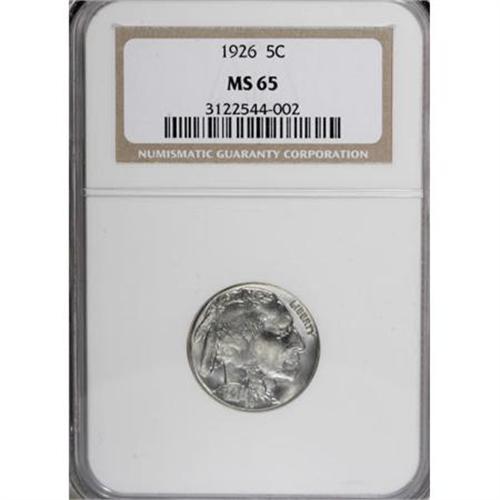 <B>1926 5C MS65 NGC.</B></I> NGC Census: (459/167). PCGS Population (825/335). Mintage: 44,693,000. Numismedia Wsl. Price for NGC/PCGS coin in MS65: $180. (#3957)<BR><BR><B>Coin Engraver:</B> James E. Fraser<BR><BR><b>Shipping:</b> Coins & Currency (<a target="_blank" href="http://www.heritageauctions.com/common/shipping.php">view shipping information</a>)