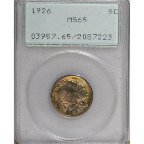 <B>1926 5C MS65 PCGS.</B></I> PCGS Population (817/327). NGC Census: (458/169). Mintage: 44,693,000. Numismedia Wsl. Price for NGC/PCGS coin in MS65: $180. (#3957)<BR><BR><B>Coin Engraver:</B> James E. Fraser<BR><BR><b>Shipping:</b> Coins & Currency (<a target="_blank" href="http://www.heritageauctions.com/common/shipping.php">view shipping information</a>)