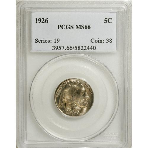 <B>1926 5C MS66 PCGS.</B></I> PCGS Population (292/24). NGC Census: (312/26). Mintage: 44,693,000. Numismedia Wsl. Price for NGC/PCGS coin in MS66: $331. (#3957)<BR><BR><b>Shipping:</b> Coins & Currency (<a target="_blank" href="http://www.heritageauctions.com/common/shipping.php">view shipping information</a>)