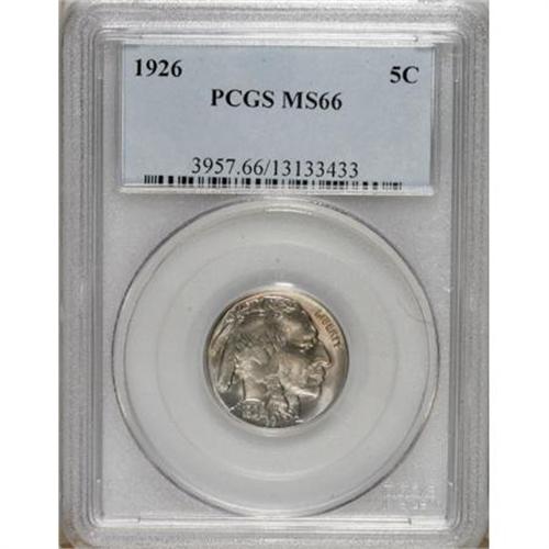 <B>1926 5C MS66 PCGS.</B></I> PCGS Population (292/24). NGC Census: (156/13). Mintage: 44,693,000. Numismedia Wsl. Price for NGC/PCGS coin in MS66: $331. (#3957)<BR><BR><b>Shipping:</b> Coins & Currency (<a target="_blank" href="http://www.heritageauctions.com/common/shipping.php">view shipping information</a>)