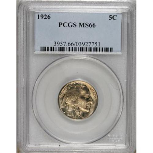 <B>1926 5C MS66 PCGS.</B></I> PCGS Population (292/24). NGC Census: (156/13). Mintage: 44,693,000. Numismedia Wsl. Price for NGC/PCGS coin in MS66: $331. (#3957)<BR><BR><b>Shipping:</b> Coins & Currency (<a target="_blank" href="http://www.heritageauctions.com/common/shipping.php">view shipping information</a>)