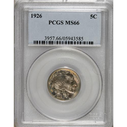 <B>1926 5C MS66 PCGS.</B></I> Well struck, lustrous, and nearly pristine, except for a couple of faint tick marks on the bison's shoulder. Steel-blue color in the centers yields to lovely crimson and gold iridescence near the peripheries.<BR><BR><b>Shipping:</b> Coins & Currency (<a target="_blank" href="http://www.heritageauctions.com/common/shipping.php">view shipping information</a>)