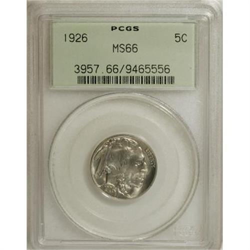 <B>1926 5C MS66 PCGS.</B></I> PCGS Population (302/23). NGC Census: (156/13). Mintage: 44,693,000. Numismedia Wsl. Price for NGC/PCGS coin in MS66: $331. (#3957)<BR><BR><B>Coin Engraver:</B> James E. Fraser<BR><BR><b>Shipping:</b> Coins & Currency (<a target="_blank" href="http://www.heritageauctions.com/common/shipping.php">view shipping information</a>)