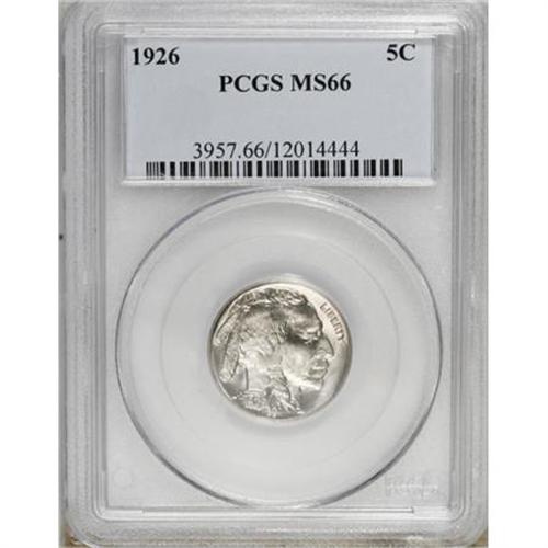 <B>1926 5C MS66 PCGS.</B></I> PCGS Population (311/24). NGC Census: (153/14). Mintage: 44,693,000. Numismedia Wsl. Price for NGC/PCGS coin in MS66: $331. (#3957)<BR><BR><B>Coin Engraver:</B> James E. Fraser<BR><BR><b>Shipping:</b> Coins & Currency (<a target="_blank" href="http://www.heritageauctions.com/common/shipping.php">view shipping information</a>)