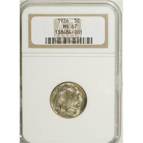 <B>1926 5C MS67 NGC.</B></I> Bright apricot patina and pleasing luster illuminate the well-preserved surfaces. This piece is well struck on the legends and throughout the bison's head and shoulder. Only a touch of softness is present on the braid. An attractive example of this mid-date P-mint issue, nearly impossible to find any finer. Population: 12 in 67, 1 finer (7/07).<BR><BR><B>Coin Engraver:</B> James E. Fraser<BR><BR><b>Shipping:</b> Coins & Currency (<a target="_blank" href="http://www.heritageauctions.com/common/shipping.php">view shipping information</a>)