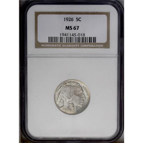 <B>1926<5C> MS67 NGC.</B></I> Sharply struck with satiny luster and exceptional aesthetic appeal. Both sides have gorgeous lilac-blue toning with lovely gold color at the edge. Only one finer example has been certified by NGC. Census: 12 in 67, 1 finer (3/06). <BR><BR><B>Important notice:</B> Heritage usually auctions material at the rate of 200-250 lots per hour. On some occasions eBay Live bid software or the Internet may not be able to keep up with the pace of the auction. We recommend placing a realistic absentee bid now as insurance to avoid disappointment. Occasionally the auctioneer may eliminate or reject an eBay Live bid, and the auctioneer may also reopen a lot after the close of the eBay live bidding (usually because we missed an audience bid), and may reject your bid even if it shows you as the winning bidder. By bidding via eBay Live, you agree that Heritage may award the lot to another bidder at its sole discretion under the circumstances described above or any other reasonable circumstances. Since eBay bids are not shown to us until we open the lot on the floor, we treat those bids just like floor bids. In most cases the floor responds before the eBay bid is presented to us, due to Internet lag time, so for consistency we have made it a policy that floor bids are always considered first over tie eBay live bids. Also please note that all Heritage lots purchased through eBay Live carry a 20% Buyer's Premium. Please make sure you read the Terms and Conditions before you bid. This lot is being auctioned in conjunction with a live floor auction by Heritage Galleries & Auctioneers. All final auction and invoice information will be supplied by Heritage Galleries & Auctioneers, and all other information should be considered preliminary. Lot:1092 <BR><BR><B>Winning Notification and Billing:</B> After the FINAL session in this auction is complete, Heritage will send e-mail and snail mail invoices. This process normally takes several days. All final auction and invoice information will be supplied by Heritage Galleries & Auctioneers, and all other information should be considered preliminary. <BR><BR>This auction will be conducted on a live auction floor and over the Internet through eBay Live. If you choose to place an absentee bid, please take a moment to <font color='#0000ff'><u><a href='http://pages.ebay.com/liveauctions/help/before/laabsentee.html'>learn how eBay Live absentee bidding works</a></u></font><font color='#000000'>