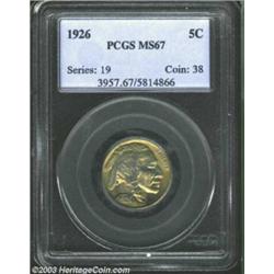 <TR><TD width="100%"><TABLE cellSpacing=1 cellPadding=3 width="100%" border=0><TBODY><TR><TD width="100%" bgColor=#79735c><FONT face=arial color=#ffffff size=3><B>Description</B> </FONT></TD></TR><TR><TD width="100%" bgColor=#ffffff><FONT face=arial size=2><B>1926 5C MS67 PCGS.</B></I> Bright multicolored patina and radiant luster illuminate the well preserved surfaces. Well struck on the legends, and on the bison's head and tail. Only the upper braid of the Indian has less than sharp definition. There is one noticeable coin-to-coin mark on Indian's cheek, and another on the bison's flank. An appealing Superb Gem, the vivid rainbow toning creates a high degree of visual appeal. Population: 15 in 67, 0 finer (4/03). </FONT></TD></TR></TBODY></TABLE></TD></TR></TBODY></TABLE><BR><A name=PricesRealized></A><TABLE cellSpacing=0 cellPadding=0 width="100%" bgColor=#000000 border=0><TBODY><TR><TD width="100%"><TABLE cellSpacing=1 cellPadding=3 width="100%" border=0><TBODY><TR><TD width="100%" bgColor=#79735c><A name=PR><FONT face=arial color=#ffffff size=3><B>Previous Prices from Heritage Auctions</B> </FONT></A></TD></TR><TR><TD bgColor=#f6f6ed><TABLE cellSpacing=0 cellPadding=0 width="100%" border=1><TBODY><TR><TD align=middle width="33%"><B>Date</B></TD><TD align=middle width="33%"><B>Service</B></TD><TD align=middle width="33%"><B>Price</B></TD></TR><TR bgColor=whitesmoke><TD width="33%"><B>06/06/1997</B></TD><TD width="33%">PCGS</TD><TD width="33%">$1,955.00</TD></TR><TR bgColor=whitesmoke><TD width="33%"><B>03/21/1998</B></TD><TD width="33%">PCGS</TD><TD width="33%">$1,782.50</TD></TR><TR bgColor=whitesmoke><TD width="33%"><B>05/03/2003</B></TD><TD width="33%">PCGS</TD><TD width="33%">$7,590.00</TD></TR><TR bgColor=whitesmoke><TD width="33%"><B>03/01/2003</B></TD><TD width="33%">NGC</TD><TD width="33%">$1,725.00</TD></TR><TR bgColor=whitesmoke><TD width="33%"><B>01/11/2003</B></TD><TD width="33%">NGC</TD><TD width="33%">$1,610.00</TD></TR><TR bgColor=whitesmoke><TD width="33%"><B>09/28/2002</B></TD><TD width="33%">NGC</TD><TD width="33%">$2,415.00</TD></TR><TR bgColor=whitesmoke><TD width="33%"><B>05/01/2001</B></TD><TD width="33%">NGC</TD><TD width="33%">$1,150.00</TD></TR><TR bgColor=whitesmoke><TD width="33%"><B>08/17/1996</B></TD><TD width="33%">NGC</TD><TD width="33%">$1,210.00</TD></TR><TR bgColor=whitesmoke><TD width="33%"><B>05/03/2003</B></TD><TD width="33%">NGC</TD><TD width="33%">$1,552.50</TD></TR></TBODY></TABLE></TD></TR><TR><TD bgColor=#ffffff><FONT face=arial size=1 ?>PLEASE NOTE: All prices realized reflect the final hammer price PLUS the buyer's premium in auctions that charge a buyer's premium. Each item has a notation at the top of the listing indicating whether that lot included a buyer's premium. Example: A item that sells with a final hammer price of $100 and a 20% buyer's premium will display with a price realized of $120. All information listed is intended to be as accurate as possible, but errors are possible. Please use this guide carefully and inform us of any inaccuracies. </FONT></TD></TR></TBODY></TABLE></TD></TR></TBODY></TABLE><BR><TABLE cellSpacing=0 cellPadding=0 width="100%" bgColor=#000000 border=0><TBODY><TR><TD width="100%"><TABLE cellSpacing=1 cellPadding=3 width="100%" border=0><TBODY><TR><TD width="100%" bgColor=#79735c colSpan=6><FONT face=arial color=#ffffff size=3><B>Price Guide*</B> </FONT></TD></TR><TR bgColor=#f6f6ed><TD align=middle><B>Grade</B> </TD><TD align=middle><B>Coin World<BR>(Trends)</B> </TD><TD align=middle><B>Numismedia<BR>Retail</B> </TD><TD align=middle><B>Numismedia<BR>Wholesale</B> </TD><TD align=middle><B>Coin<BR>Universe</B> </TD><TD align=middle><B>Heritage<BR>Value Index</B> </TD></TR><TR bgColor=#ffffff><TD align=middle>66</TD><TD align=right>$725.00</TD><TD align=right>$430.00</TD><TD align=right>$331.00</TD><TD align=right>$400.00</TD><TD align=right>$354.17</TD></TR><TR style="FONT-WEIGHT: bold" bgColor=#cccfdd><TD align=middle>67</TD><TD align=right>---</TD><TD align=right>---</TD><TD align=right>$2,125.00</TD><TD align=right>$3,000.00</TD><TD align=right>$2,257.50</TD></TR><TR bgColor=#ffffff><TD align=middle>68</TD><TD align=right>---</TD><TD align=right>---</TD><TD align=right>$12,500.00</TD><TD align=right>---</TD><TD align=right>---</TD></TR><TR bgColor=#ffffff><TD colSpan=6><FONT size=1>*All information listed is intended to be as accurate as possible, but errors are possible. No item may be returned or refused based on this information which is provided as a service to our customers. You should contact each pricing source directly to determine the accuracy of this information. </FONT></TD></TR></TBODY></TABLE></TD></TR></TBODY></TABLE><BR><TABLE cellSpacing=0 cellPadding=0 width="100%" bgColor=#000000 border=0><TBODY><TR><TD width="100%"><TABLE cellSpacing=1 cellPadding=3 width="100%" border=0><TBODY><TR><TD width="100%" bgColor=#79735c><FONT face=arial color=#ffffff size=3><B>Population Guide</B> </FONT></TD></TR><TR bgColor=#ffffff><TD align=middle><!-- Begin Output of Population Grid--><TABLE cellSpacing=0 cellPadding=0 width="100%" border=0><TBODY><TR><TD vAlign=center><TABLE cellSpacing=0 width="100%" border=1 cellsadding="3"><TBODY><TR><TD vAlign=center><TABLE cellSpacing=0 cellPadding=3 width="100%" border=1><TBODY><TR><TD vAlign=center align=middle bgColor=#f0f1e8 colSpan=2 <CENTER><FONT face=Arial size=2><B>PCGS Pop </B></FONT><CENTER></CENTER></TD><TD vAlign=center align=middle bgColor=#f0f1e8 colSpan=2><CENTER><FONT face=Arial size=2><B>NGC Pop</B></CENTER></FONT></TD></TR><TR><TD vAlign=center><FONT face=Arial size=2>(67)</FONT> </TD><TD vAlign=center align=right><FONT face=Arial size=2>15</FONT> </TD><TD vAlign=center><FONT face=Arial size=2>(67)</FONT> </TD><TD vAlign=center align=right><FONT face=Arial size=2>6</FONT> </TD></TR><TR><TD vAlign=center><FONT face=Arial size=2>(>67)</FONT> </TD><TD vAlign=center align=right><FONT face=Arial size=2>0</FONT> </TD><TD vAlign=center><FONT face=Arial si