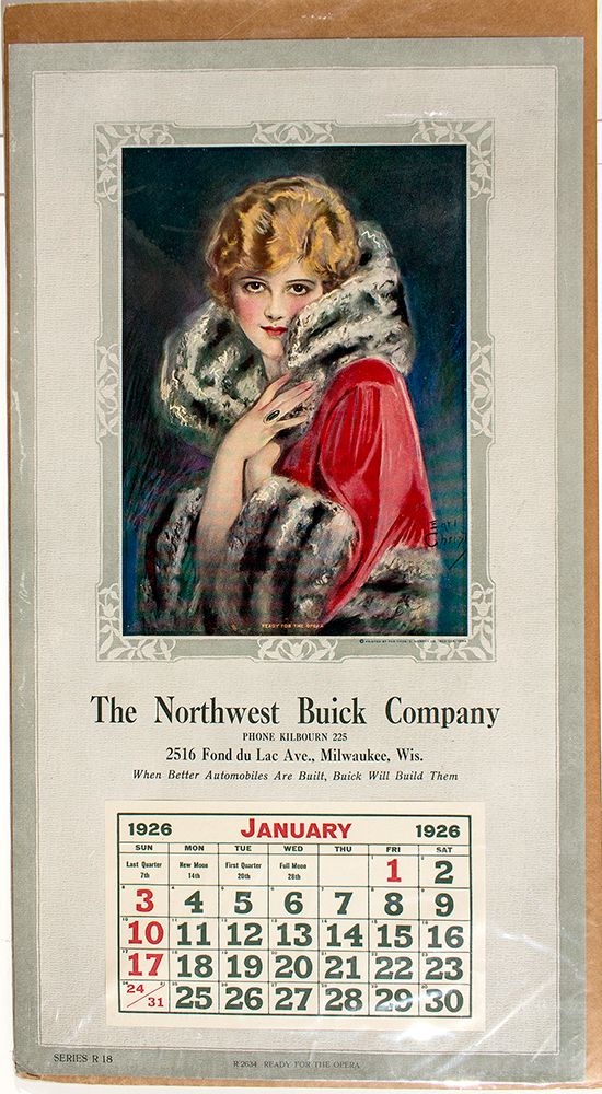 c1926 This is a 1026 calender for the Northwest Buick Compny. The head piece has a lovely print of a painting done by F. Earl Christy (1882-1961). Piece measures 21"x 11" and is in very good condition. - HKA#65978