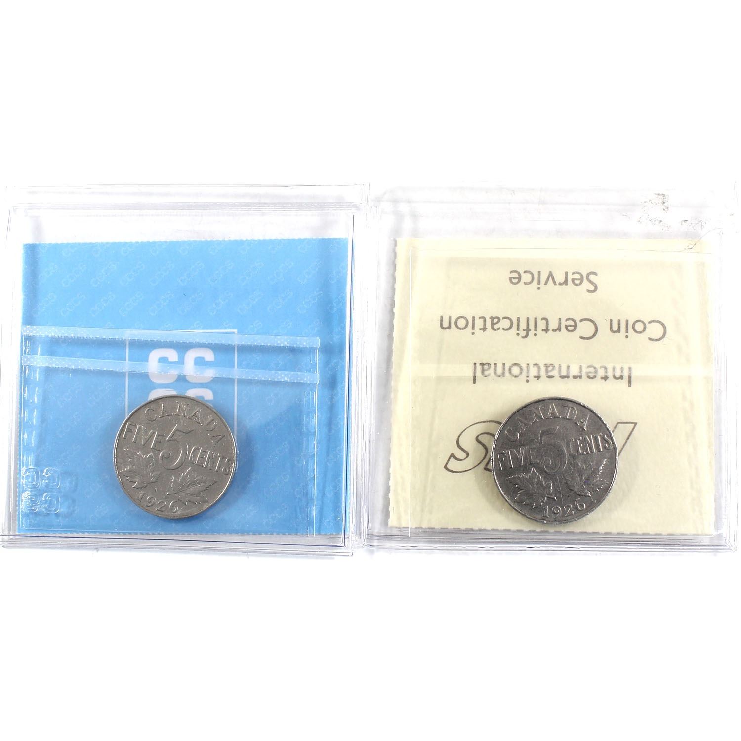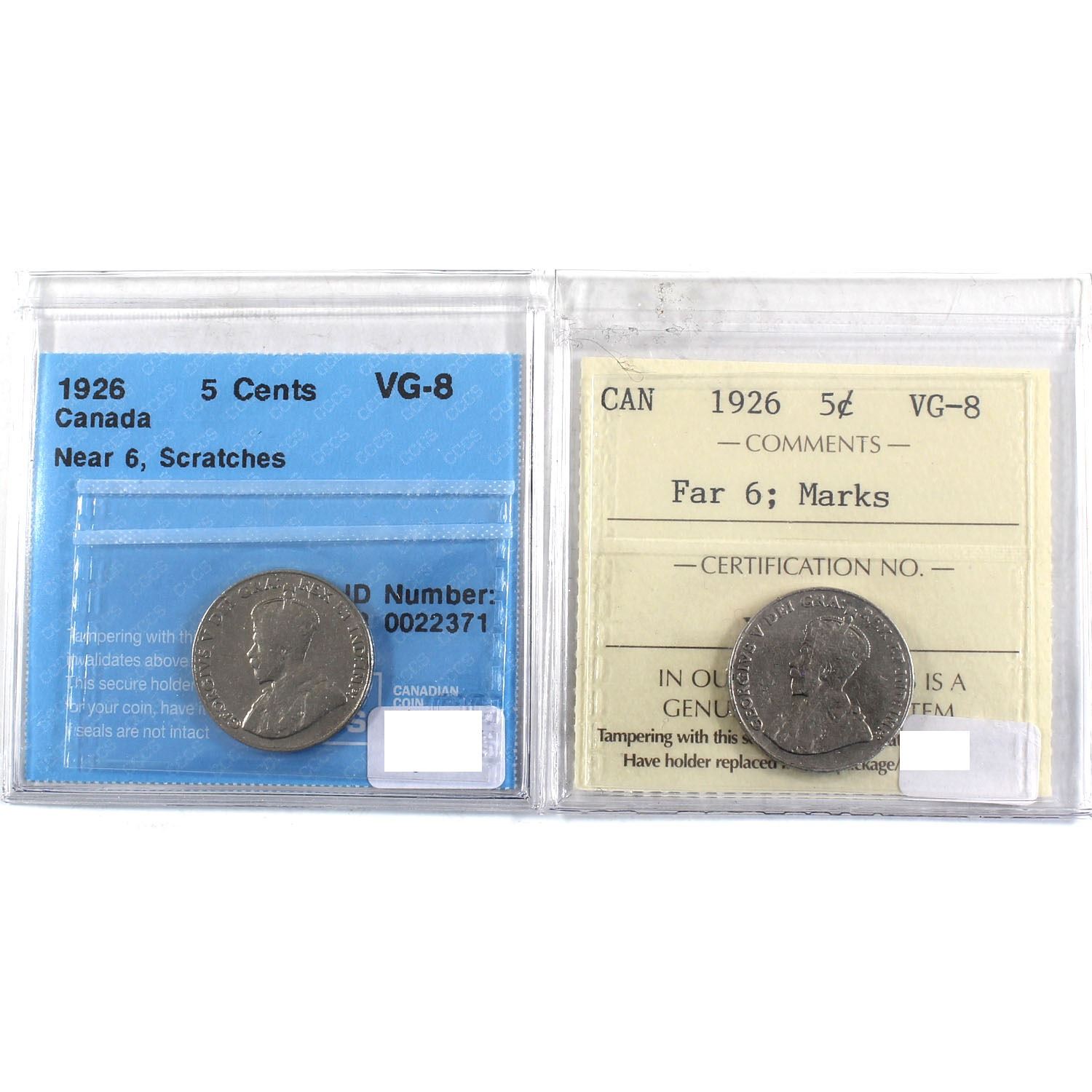 1926 Canada 5-cent Near 6 & Far 6 Certified VG-8. Near 6 CCCS Certified (scratches) & Far 6 ICCS Certified (Marks). 2pcs