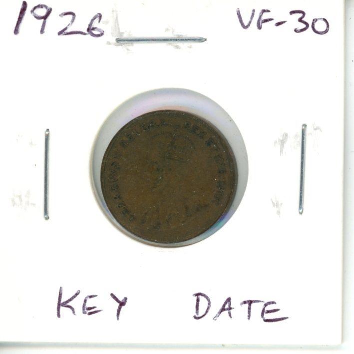 1926 Canadian Small Cent. Key Date. Mintage of 2,143,372. VF-30.