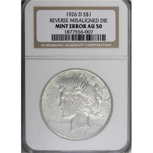 <B>1926-D $1 Peace Dollar--Reverse Misaligned Die--AU50 NGC.</B></I> NGC Census: (34/2454). PCGS Population (28/4100). Mintage: 2,348,700. Numismedia Wsl. Price for NGC/PCGS coin in AU50: $25. (#7368)<BR><BR><B>Coin Engraver:</B> Anthony de Francisci<BR><BR><b>Shipping:</b> Coins & Currency (<a target="_blank" href="http://www.heritageauctions.com/common/shipping.php">view shipping information</a>)