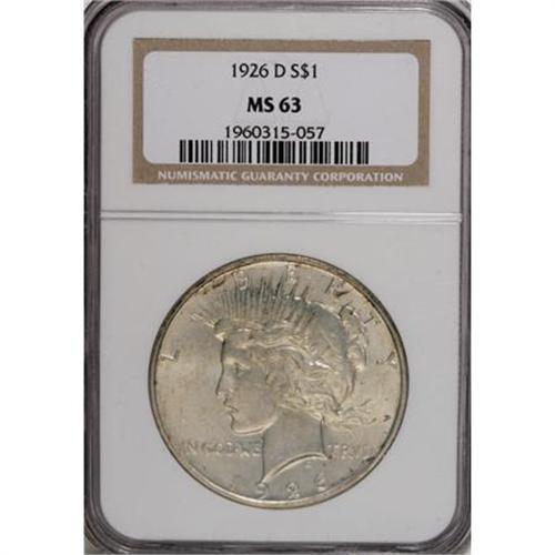 <B>1926-D $1 MS63 NGC.</B></I> . NGC Census: (539/1425). PCGS Population (1005/2106). Mintage: 2,348,700. Numismedia Wsl. Price for NGC/PCGS coin in MS63: $140. (#7368)<BR><BR><B>Coin Engraver:</B> Anthony de Francisci<BR><BR><b>Shipping:</b> Coins & Currency (<a target="_blank" href="http://www.heritageauctions.com/common/shipping.php">view shipping information</a>)