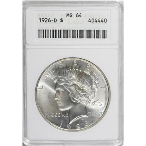 <B>1926-D $1 MS64 ANACS.</B></I> NGC Census: (861/536). PCGS Population (1260/745). Mintage: 2,348,700. Numismedia Wsl. Price for NGC/PCGS coin in MS64: $244. (#7368)<BR><BR><b>Shipping:</b> Coins & Currency (<a target="_blank" href="http://www.heritageauctions.com/common/shipping.php">view shipping information</a>)