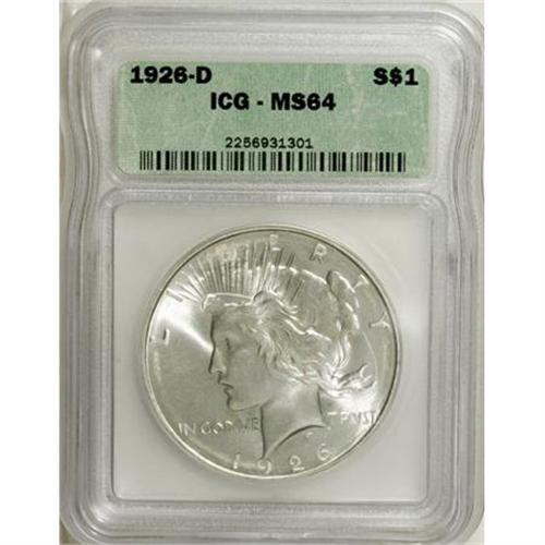 <B>1926-D $1 MS64 ICG.</B></I> NGC Census: (858/535). PCGS Population (1260/745). Mintage: 2,348,700. Numismedia Wsl. Price for NGC/PCGS coin in MS64: $244. (#7368)<BR><BR><b>Shipping:</b> Coins & Currency (<a target="_blank" href="http://www.heritageauctions.com/common/shipping.php">view shipping information</a>)