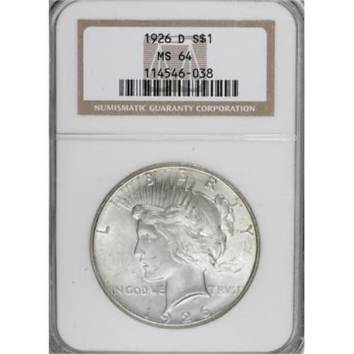 <B>1926-D $1 MS64 NGC.</B></I> NGC Census: (868/536). PCGS Population (1290/769). Mintage: 2,348,700. Numismedia Wsl. Price for NGC/PCGS coin in MS64: $244. (#7368)<BR><BR><B>Coin Engraver:</B> Anthony de Francisci<BR><BR><b>Shipping:</b> Coins & Currency (<a target="_blank" href="http://www.heritageauctions.com/common/shipping.php">view shipping information</a>)