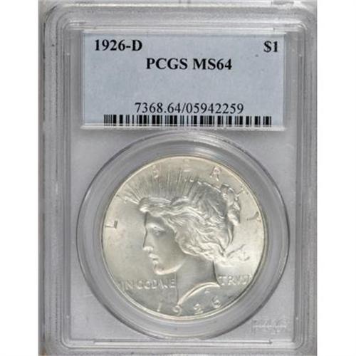 <B>1926-D $1 MS64 PCGS.</B></I> PCGS Population (1303/783). NGC Census: (870/540). Mintage: 2,348,700. Numismedia Wsl. Price for NGC/PCGS coin in MS64: $244. (#7368)<BR><BR><B>Coin Engraver:</B> Anthony de Francisci<BR><BR><b>Shipping:</b> Coins & Currency (<a target="_blank" href="http://www.heritageauctions.com/common/shipping.php">view shipping information</a>)