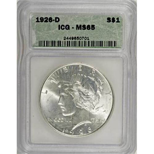 <B>1926-D $1 MS65 ICG.</B></I> Strongly lustrous and predominantly silver-white with splashes of thin, milky patina over each side. A boldly impressed and appealing representative of this mid-date D-mint issue.<BR><BR><B>Coin Engraver:</B> Anthony de Francisci<BR><BR><b>Shipping:</b> Coins & Currency (<a target="_blank" href="http://www.heritageauctions.com/common/shipping.php">view shipping information</a>)