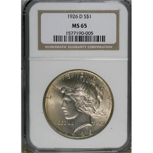 <B>1926-D $1 MS65 NGC.</B></I> Honey-gold and pearl-gray toning graces this lustrous and pleasing Gem. The centers are razor-sharp, although a few letters near the rims are incomplete. The cheek is void of marks.<BR><BR><B>Coin Engraver:</B> Anthony de Francisci<BR><BR><b>Shipping:</b> Coins & Currency (<a target="_blank" href="http://www.heritageauctions.com/common/shipping.php">view shipping information</a>)