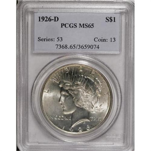 <B>1926-D $1 MS65 PCGS.</B></I> . PCGS Population (613/173). NGC Census: (436/108). Mintage: 2,348,700. Numismedia Wsl. Price for NGC/PCGS coin in MS65: $580. (#7368)<BR><BR><B>Coin Engraver:</B> Anthony de Francisci<BR><BR><b>Shipping:</b> Coins & Currency (<a target="_blank" href="http://www.heritageauctions.com/common/shipping.php">view shipping information</a>)