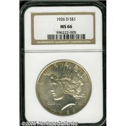 <B>1926-D<img border='0' src='http://www.heritagecoins.com/images/star.gif' width=10 height=10>$1 MS66 NGC.</B></I> Sharply struck, with bright, lightly toned surfaces that are free of mentionable marks.