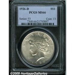 <B>1926-D<img border='0' src='http://www.heritagecoins.com/images/star.gif' width=10 height=10>$1 MS66 PCGS.</B></I> The design elements are crisply impressed, and the lustrous, nearly untoned surfaces reveal just a couple of minute marks on the eagle's wings. A flashy looking coin.