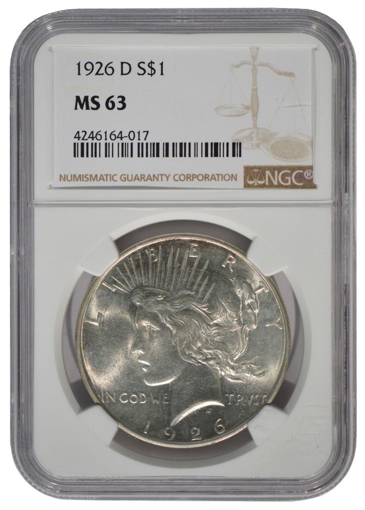 One 1926-D $1 Peace Silver Dollar Coin NGC MS63.