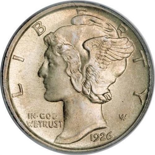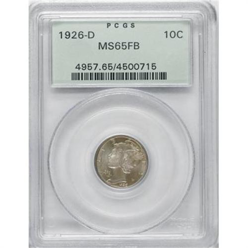 <B>1926-D 10C MS65 Full Bands PCGS.</B></I> Crisply struck with lovely gold and rose highlights over the smooth dove-gray surfaces. Well struck save for unimportant softness on the central letters in STATES. An impressive example of this scarce branch mint issue. Housed in a green label holder. Population: 66 in 65 Full Bands, 19 finer (11/07).<BR><BR><B>Coin Engraver:</B> Adolph A. Weinman<BR><BR><b>Shipping:</b> Coins & Currency (<a target="_blank" href="http://www.heritageauctions.com/common/shipping.php">view shipping information</a>)
