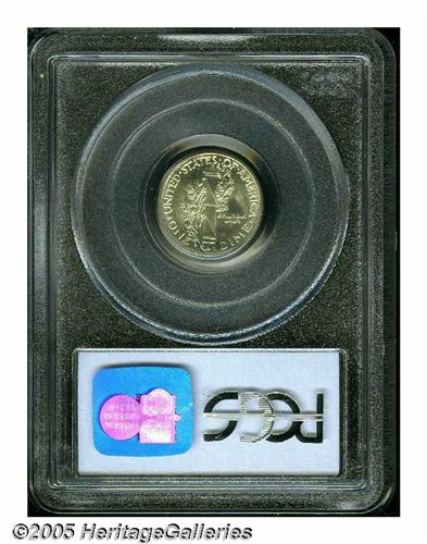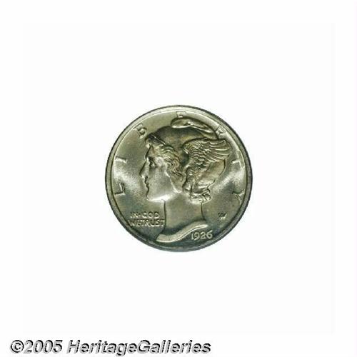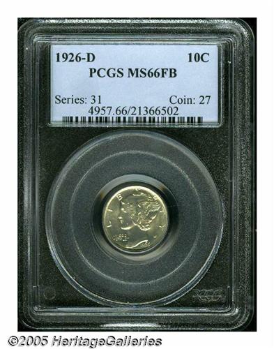 <B>1926-D<10C> MS66 Full Bands PCGS.</B></I> A popular issue because of its low mintage of only 6.82 million pieces, the '26-D dime is also moderately scarce. This high grade Gem is well struck for the type and for the issue, with very slight softness on the tops of the letters in STATES OF AMERICA on the upper reverse rim; this is characteristic of the date. Strong luster exudes from light tan surfaces that are devoid of significant abrasions. A few tiny, inoffensive marks on the fasces are mentioned for accuracy. Also, a fine die crack is visible on Mercury's cap. Population: 17 in 66, 1 finer (6/05).