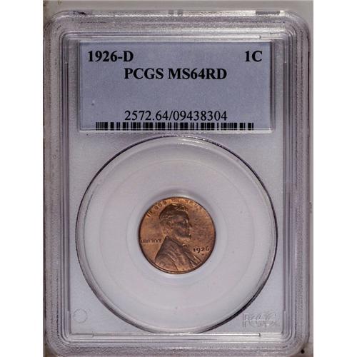 <B>1926-D<1C> MS64 Red PCGS.</B></I> A satiny brick-red near-Gem with only slight mellowing of the obverse color. The strike is sharp for the branch mint issue, if not absolute on the lower right reverse quadrant. <BR><BR><B>Important notice:</B> Heritage usually auctions material at the rate of 200-250 lots per hour. On some occasions eBay Live bid software or the Internet may not be able to keep up with the pace of the auction. We recommend placing a realistic absentee bid now as insurance to avoid disappointment. Occasionally the auctioneer may eliminate or reject an eBay Live bid, and the auctioneer may also reopen a lot after the close of the eBay live bidding (usually because we missed an audience bid), and may reject your bid even if it shows you as the winning bidder. By bidding via eBay Live, you agree that Heritage may award the lot to another bidder at its sole discretion under the circumstances described above or any other reasonable circumstances. Since eBay bids are not shown to us until we open the lot on the floor, we treat those bids just like floor bids. In most cases the floor responds before the eBay bid is presented to us, due to Internet lag time, so for consistency we have made it a policy that floor bids are always considered first over tie eBay live bids. Also please note that all Heritage lots purchased through eBay Live carry a 20% Buyer's Premium. Please make sure you read the Terms and Conditions before you bid. This lot is being auctioned in conjunction with a live floor auction by Heritage Galleries & Auctioneers. All final auction and invoice information will be supplied by Heritage Galleries & Auctioneers, and all other information should be considered preliminary. Lot:648 <BR><BR><B>Winning Notification and Billing:</B> After the FINAL session in this auction is complete, Heritage will send e-mail and snail mail invoices. This process normally takes several days. All final auction and invoice information will be supplied by Heritage Galleries & Auctioneers, and all other information should be considered preliminary. <BR><BR>This auction will be conducted on a live auction floor and over the Internet through eBay Live. If you choose to place an absentee bid, please take a moment to <font color='#0000ff'><u><a href='http://pages.ebay.com/liveauctions/help/before/laabsentee.html'>learn how eBay Live absentee bidding works</a></u></font><font color='#000000'>