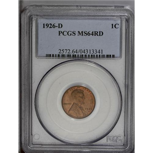 <B>1926-D<1C> MS64 Red PCGS.</B></I> A scarce issue in full red that is generally overlooked in favor of its San Francisco counterpart. Moderate brick-red with just a few flyspecks keeping it from a full Gem rating.<BR><I>From The Tigard Oregon Small Cent Collection.</B></I>