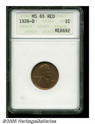 <B>1926-D<1C> MS65 Red ANACS.</B></I> A pleasing Gem that has a bold strike and dusky olive and orange colors. Each side has a single small carbon fleck, but certainly an outstanding piece overall.