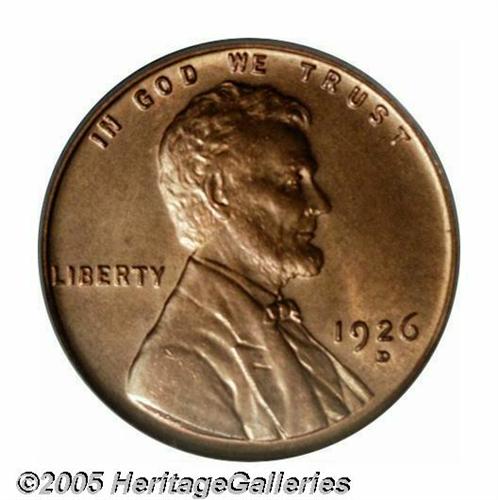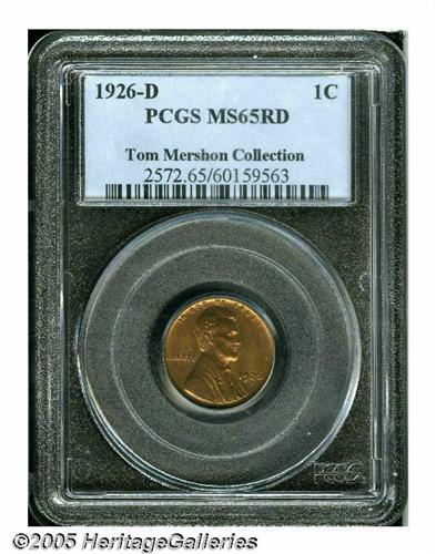 <B>1926-D<1C> MS65 Red PCGS.</B></I> Sharply defined throughout, the surfaces display full red color that is so difficult to locate on coins of this issue. The surfaces are remarkably clean and problem-free, with a slight amount of muting of color on both sides. In spite of the 1926-D cent's reputation for weakly struck coins with poor color, this is an unusually well produced and equally well preserved example. Population: 41 in 65, 1 finer (3/05).<BR><I>From The Tom Mershon #2 All-Time PCGS Registry Set of Lincoln Wheat Cents.</B></I>
