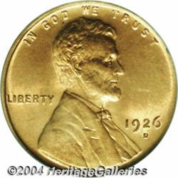 <B>1926-D<1C> MS65 Red PCGS.</B></I> While common in low grades, higher grade circs are moderately scarce, and Uncirculated pieces are definitely scarce. Consistently poor quality prevents most coins from achieving the Gem level. This is an attractive coin that has uniform bright red color on the obverse, the reverse is a shade deeper in hue with a few darker splotches of color on the lower reverse. Boldly struck throughout. Population: 38 in 65, 1 finer (7/04). <BR><BR><B>Important notice:</B> Heritage usually auctions material at the rate of 200-250 lots per hour. On some occasions eBay Live bid software or the Internet may not be able to keep up with the pace of the auction. We recommend placing a realistic absentee bid now as insurance to avoid disappointment. Occasionally the auctioneer may eliminate or reject an eBay Live bid, and the auctioneer may also reopen a lot after the close of the eBay live bidding (usually because we missed an audience bid), and may reject your bid even if it shows you as the winning bidder. By bidding via eBay Live, you agree that Heritage may award the lot to another bidder at its sole discretion under the circumstances described above or any other reasonable circumstances. Since eBay bids are not shown to us until we open the lot on the floor, we treat those bids just like floor bids. In most cases the floor responds before the eBay bid is presented to us, due to Internet lag time, so for consistency we have made it a policy that floor bids are always considered first over tie eBay live bids. Also please note that all Heritage lots purchased through eBay Live carry a 20% Buyer's Premium. Please make sure you read the Terms and Conditions before you bid. </span></font></tr></table></td></tr></table>