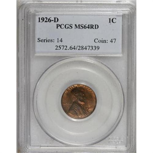 <B>1926-D 1C MS64 Red PCGS.</B></I> PCGS Population (120/45). NGC Census: (29/5). Mintage: 28,020,000. Numismedia Wsl. Price for NGC/PCGS coin in MS64: $525. (#2572)<BR><BR><B>Coin Engraver:</B> Victor D. Brenner<BR><BR><b>Shipping:</b> Coins & Currency (<a target="_blank" href="http://www.heritageauctions.com/common/shipping.php">view shipping information</a>)