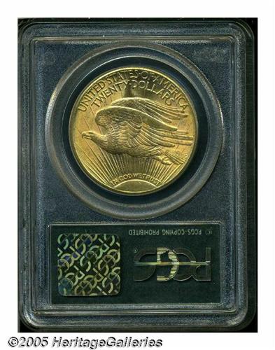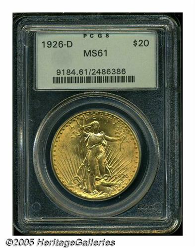 <B>1926-D<$20> MS61 PCGS.</B></I> Typically struck with some fadeaway noted on the lower obverse, but also displaying lovely yellow-gold colors, and appealing satiny luster. A handful of moderately heavy bagmarks, particularly on the reverse, seemingly account for the lower Mint State grade. The 1926-D is among the scarcest and most underrated dates in this popular series. In terms of overall rarity, Akers rates the '26-D 13th out of 55 issues in the Saint-Gaudens Double Eagle series.