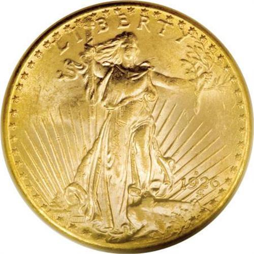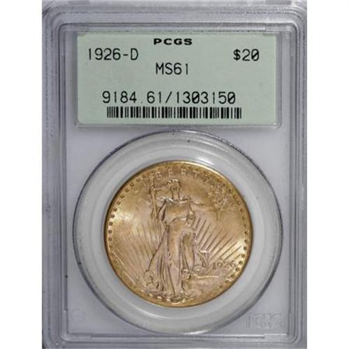 <B>1926-D $20 MS61 PCGS.</B></I> Though it does not appear on many collectors' radars as a particularly elusive issue, the 1926-D was among the later dates with populations decimated by the gold recall of 1933, with fewer than one-tenth of 1% of the original production run of 481,000 pieces certified. This attractive example has strong detail overall, though it displays this issue's typical weakness on the dome of the Capitol building on the obverse. Strong luster and dappled straw-gold and orange coloration gives this piece an unusual, captivating appearance. While scattered light to moderate abrasions affect both the fields and the devices, the overall eye appeal is more suggestive of an MS62 than of the grade assigned. An interesting and appealing example of this often-overlooked later issue. Housed in an old green label holder.<BR><BR><B>Coin Engraver:</B> Augustus Saint-Gaudens<BR><BR><b>Shipping:</b> Coins & Currency (<a target="_blank" href="http://www.heritageauctions.com/common/shipping.php">view shipping information</a>\)