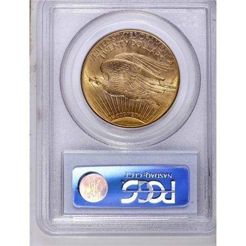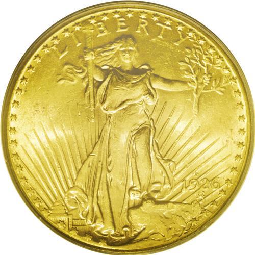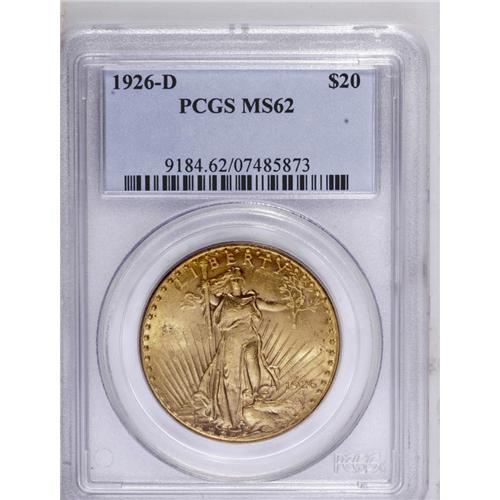 <B>1926-D<$20> MS62 PCGS.</B></I> The 1926-D is among the scarcest and most underrated dates in this popular series. This issue is more difficult to locate than the 1924-D, 1924-S, and 1925-S. In terms of overall rarity, Akers rates the '26-D 13th out of 55 issues in the Saint-Gaudens double eagle series, a rank that it shares with the 1925-D and 1929. A pleasing coin for the grade, this example shows crisp overall detail and remarkably bright, flashy mint frost over both sides. The lovely medium orange-gold coloration grows slightly deeper near the peripheries. There are a reasonable number of abrasions for a gold coin of this size.