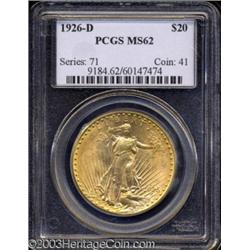 <table><tr><td><TABLE cellSpacing=0 cellPadding=0 width="100%" bgColor=#000000 border=0><TBODY> <TR><TD width="100%"><TABLE cellSpacing=1 cellPadding=3 width="100%" border=0><TBODY><TR><TD width="100%" bgColor=#79735c><FONT face=arial color=#ffffff size=3><B>Description</B> </FONT></TD></TR><TR><TD width="100%" bgColor=#ffffff><FONT face=arial size=2><B>1926-D $20 MS62 PCGS.</B></I> Typically struck with some fadeaway noted on the lower obverse, but also displaying lovely pink and reddish-gold colors, and appealing satiny luster. A handful of moderately heavy bagmarks, on each side, seemingly account for the lower Mint State grade. The 1926-D is among the scarcest and most underrated dates in this popular series. In terms of overall rarity, Akers rates the '26-D 13th out of 55 issues in the Saint-Gaudens double eagle series. Population: 55 in 62, 46 finer (9/03). </FONT></TD></TR></TBODY></TABLE></TD></TR></TBODY></TABLE><BR><A name=PricesRealized></A><TABLE cellSpacing=0 cellPadding=0 width="100%" bgColor=#000000 border=0><TBODY><TR><TD width="100%"><TABLE cellSpacing=1 cellPadding=3 width="100%" border=0><TBODY><TR><TD width="100%" bgColor=#79735c><A name=PR><FONT face=arial color=#ffffff size=3><B>Previous Prices from Heritage Auctions</B> </FONT></A></TD></TR><TR><TD bgColor=#f6f6ed><TABLE cellSpacing=0 cellPadding=0 width="100%" border=1><TBODY><TR><TD align=middle width="33%"><B>Date</B></TD><TD align=middle width="33%"><B>Service</B></TD><TD align=middle width="33%"><B>Price</B></TD></TR><TR bgColor=whitesmoke><TD width="33%"><B>08/13/1999</B></TD><TD width="33%">NGC</TD><TD width="33%">$7,762.50</TD></TR><TR bgColor=whitesmoke><TD width="33%"><B>04/28/1999</B></TD><TD width="33%">PCGS</TD><TD width="33%">$9,185.00</TD></TR><TR bgColor=whitesmoke><TD width="33%"><B>01/01/1997</B></TD><TD width="33%">PCGS</TD><TD width="33%">$8,525.00</TD></TR><TR bgColor=whitesmoke><TD width="33%"><B>03/01/1996</B></TD><TD width="33%">PCGS</TD><TD width="33%">$8,800.00</TD></TR></TBODY></TABLE></TD></TR><TR><TD bgColor=#ffffff><FONT face=arial size=1 ?>PLEASE NOTE: All prices realized reflect the final hammer price PLUS the buyer's premium in auctions that charge a buyer's premium. Each item has a notation at the top of the listing indicating whether that lot included a buyer's premium. Example: A item that sells with a final hammer price of $100 and a 20% buyer's premium will display with a price realized of $120. All information listed is intended to be as accurate as possible, but errors are possible. Please use this guide carefully and inform us of any inaccuracies. </FONT></TD></TR></TBODY></TABLE></TD></TR></TBODY></TABLE><BR><TABLE cellSpacing=0 cellPadding=0 width="100%" bgColor=#000000 border=0><TBODY><TR><TD width="100%"><TABLE cellSpacing=1 cellPadding=3 width="100%" border=0><TBODY><TR><TD width="100%" bgColor=#79735c colSpan=6><FONT face=arial color=#ffffff size=3><B>Price Guide*</B> </FONT></TD></TR><TR bgColor=#f6f6ed><TD align=middle><B>Grade</B> </TD><TD align=middle><B>Coin World<BR>(Trends)</B> </TD><TD align=middle><B>Numismedia<BR>Retail</B> </TD><TD align=middle><B>Numismedia<BR>Wholesale</B> </TD><TD align=middle><B>Coin<BR>Universe</B> </TD><TD align=middle><B>Heritage<BR>Value Index</B> </TD></TR><TR bgColor=#ffffff><TD align=middle>61</TD><TD align=right>$10,000.00</TD><TD align=right>---</TD><TD align=right>$6,750.00</TD><TD align=right>$7,650.00</TD><TD align=right>$6,898.33</TD></TR><TR style="FONT-WEIGHT: bold" bgColor=#cccfdd><TD align=middle>62</TD><TD align=right>$15,000.00</TD><TD align=right>---</TD><TD align=right>$7,475.00</TD><TD align=right>$10,000.00</TD><TD align=right>$9,082.50</TD></TR><TR bgColor=#ffffff><TD align=middle>63</TD><TD align=right>$25,000.00</TD><TD align=right>---</TD><TD align=right>$16,275.00</TD><TD align=right>$22,500.00</TD><TD align=right>$15,405.00</TD></TR><TR bgColor=#ffffff><TD colSpan=6><FONT size=1>*All information listed is intended to be as accurate as possible, but errors are possible. No item may be returned or refused based on this information which is provided as a service to our customers. You should contact each pricing source directly to determine the accuracy of this information. </FONT></TD></TR></TBODY></TABLE></TD></TR></TBODY></TABLE><BR><TABLE cellSpacing=0 cellPadding=0 width="100%" bgColor=#000000 border=0><TBODY><TR><TD width="100%"><TABLE cellSpacing=1 cellPadding=3 width="100%" border=0><TBODY><TR><TD width="100%" bgColor=#79735c><FONT face=arial color=#ffffff size=3><B>Population Guide</B> </FONT></TD></TR><TR bgColor=#ffffff><TD align=middle><!-- Begin Output of Population Grid--><TABLE cellSpacing=0 cellPadding=0 width="100%" border=0><TBODY><TR><TD vAlign=center><TABLE cellSpacing=0 width="100%" border=1 cellsadding="3"><TBODY><TR><TD vAlign=center><TABLE cellSpacing=0 cellPadding=3 width="100%" border=1><TBODY><TR><TD vAlign=center align=middle bgColor=#f0f1e8 colSpan=2 <CENTER><FONT face=Arial size=2><B>PCGS Pop </B></FONT><CENTER></CENTER></TD><TD vAlign=center align=middle bgColor=#f0f1e8 colSpan=2><CENTER><FONT face=Arial size=2><B>NGC Pop</B></CENTER></FONT></TD></TR><TR><TD vAlign=center><FONT face=Arial size=2>(62)</FONT> </TD><TD vAlign=center align=right><FONT face=Arial size=2>54</FONT> </TD><TD vAlign=center><FONT face=Arial size=2>(62)</FONT> </TD><TD vAlign=center align=right><FONT face=Arial size=2>43</FONT> </TD></TR><TR><TD vAlign=center><FONT face=Arial size=2>(>62)</FONT> </TD><TD vAlign=center align=right><FONT face=Arial size=2>49</FONT> </TD><TD vAlign=center><FONT face=Arial size=2>(>62)</FONT> </TD><TD vAlign=center align=right><FONT face=Arial size=2>28</FONT> </TD></TR></TBODY></TABLE></TD></TR></TBODY></TABLE></TD></TR></TBODY></TABLE><!-- End Output of Population Grid--></TD></TR></TBODY></TABLE></TD></TR></TBODY></TABLE><BR><TABLE cellSpacing=0 cellPadding=0 width="100%" bgColor=#000000 border=0><TBODY><TR> Important notice: Heritage usually auctions material at the rate of 20