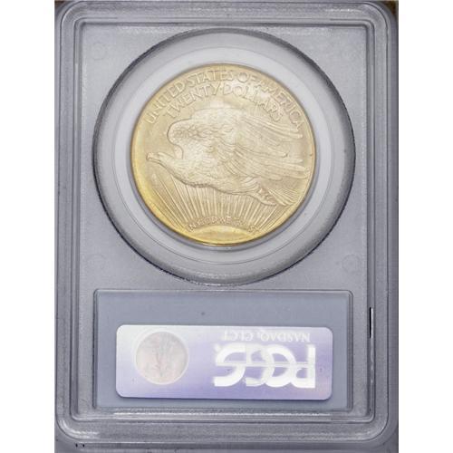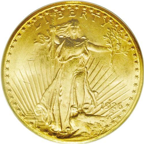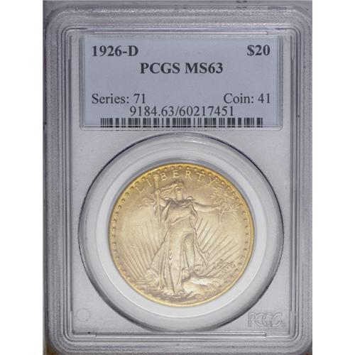 <B>1926-D<$20> MS63 PCGS.</B></I> This is a lower mintage issue with just 481,000 pieces struck. Most examples of this date were melted, with few remaining survivors. Certainly a few reached circulation, but most of those that were released found immediate storage in bank vaults. The typical '26-D Saint that reaches the market today is in Mint State, but at the lowest levels, either MS60 or MS61. This remains as one of the most underrated of all Saint-Gaudens double eagles.<BR> Considering the assigned grade of this coin, it is hard to imagine a more attractive example. The surfaces have frosty luster with rich antique-gold coloration at the borders on each side. It is a sharply struck example with nearly every detail boldly evident, except for the peripheral details at the bottom obverse. The dome of the capitol, for example, is ill-defined. Despite this weakness in design, the overall aesthetic appeal and technical appearance are not affected. There are only a few small marks in the obverse fields, and these are convenient pedigree markers, should the collector consider it desirable to learn the ownership history. Like the 1925-S, to which it compares favorably in terms of overall rarity, the 1926-D is one of the most underrated Saint-Gaudens double eagles at the finer levels of Uncirculated preservation. Population: 54 in 63, 22 finer (3/06).